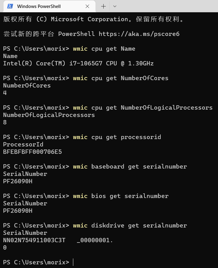 1 2 3 4 5 6 7 8 9 10 11 12 13 14 获取cpu名称 wmic cpu get Name 获取cpu核心数 wmic cpu get NumberOfCores 获取cpu线程数 wmic cpu get NumberOfLogicalProcessors 查询cpu序列号 wmic cpu get processorid 查询主板序列号 wmic baseboard get serialnumber 查询BIOS序列号 wmic bios get serialnumber 查看硬盘 wmic diskdrive get serialnumber