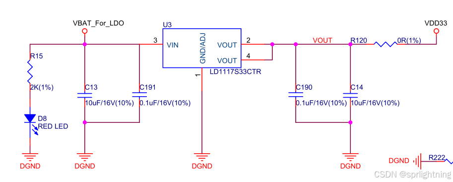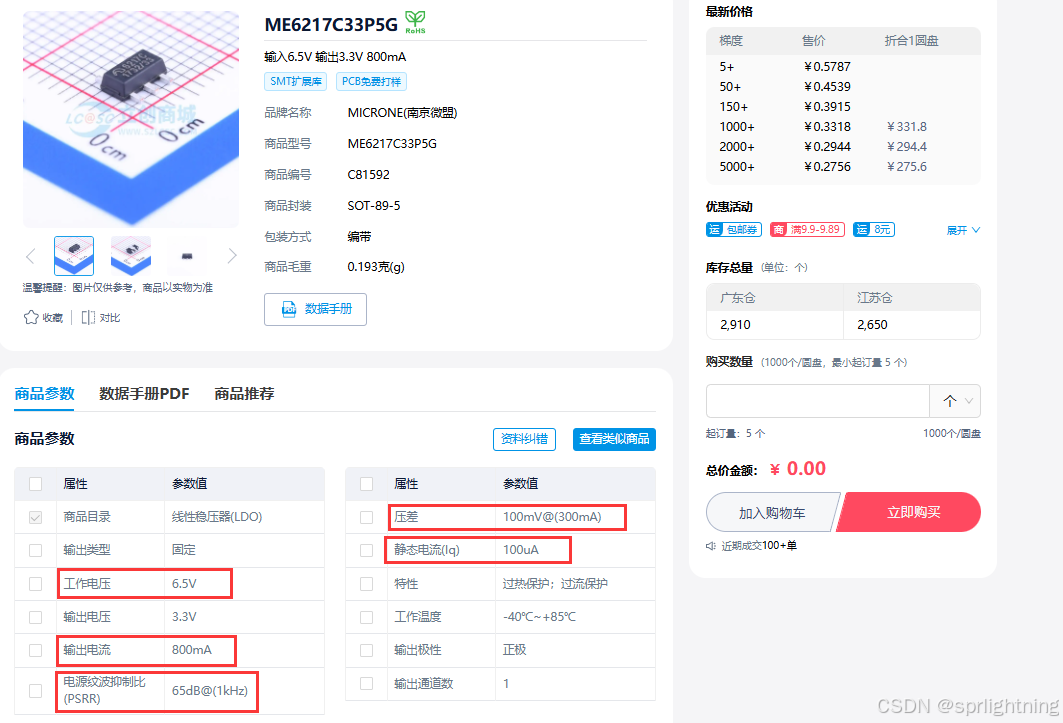 再看看可供代替的ME6217C33,Vi_max比较小是6.5V,Io_max是800mA,Vd很低是100mV,Iq低至0.1mA,价格也很便宜。这才是真正的低压差LDO!对于LyratV43这种使用microUSB(梯形安卓口)供电,使用锂电池的板子,6.5V输入的LDO完全够了,性能强大还便宜。真搞不懂画电路的人是怎么想的,这破microUSB就是5.0-5.1V,你搞个高压差大静态电流的1117是什么意思?贵就算了,性能还拉跨,1117唯一的优势高输入电压在这里毫无用处