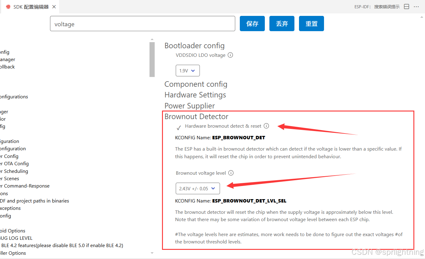 我看了看menuconfig,还真有这设置,默认就勾选了Hardware brownout detector reset,触发电压是2.43V +/- 0.05,可是这和我的情况有些差异。因为终端中提示的是0x1,也就是EN被拉低引起的硬件复位。这说明是掉电了没错,但还不至于触发brownout,因为brownout是软件复位,是0xc,且会在终端看到如下提示(软件复位详见:brownout引起的软件复位):