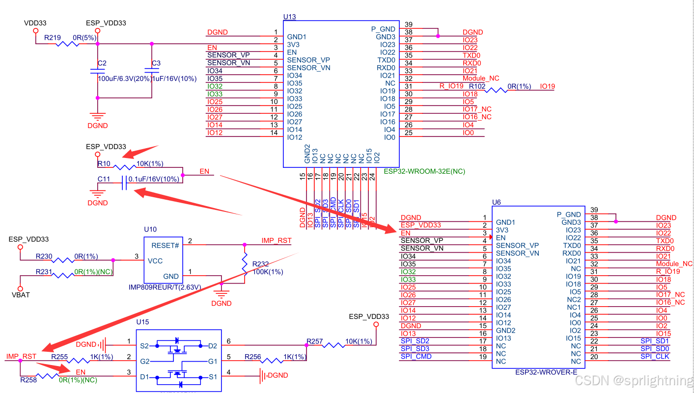 再看看LyratV43原理图,低压复位芯片输出通过两个2N700K间接控制EN,和上述应用一致。所以上电的过程会因为电压缓慢升高而复位一次,后面phy_init期间拉低3V3又会产生一次复位。