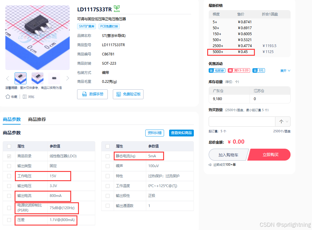 LD1117S33 Vi_max很大是15V,Io_max电流800mA,Vd很高是1-1.1V,Iq高达5mA,价格也不便宜。