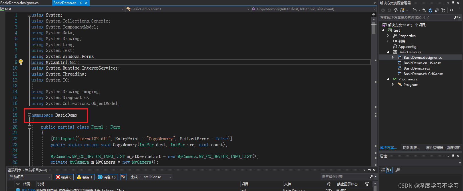 4.修改BasisDemo.cs和BascDemo.designer.cs代码中的命名空间为新项目的命令空间。不改问题也不大!