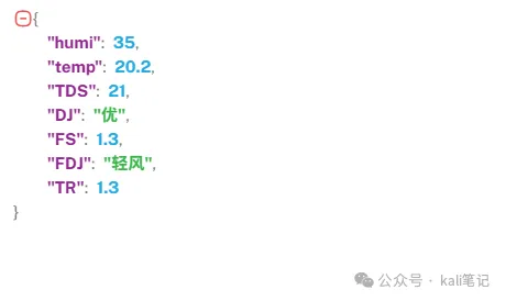 1 | {"humi": 35, "temp": 20.20,"TDS":21,"DJ":"优","FS":1.3,"FDJ":"轻风","TR":1.3} |