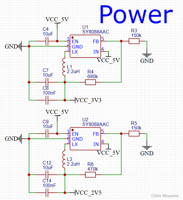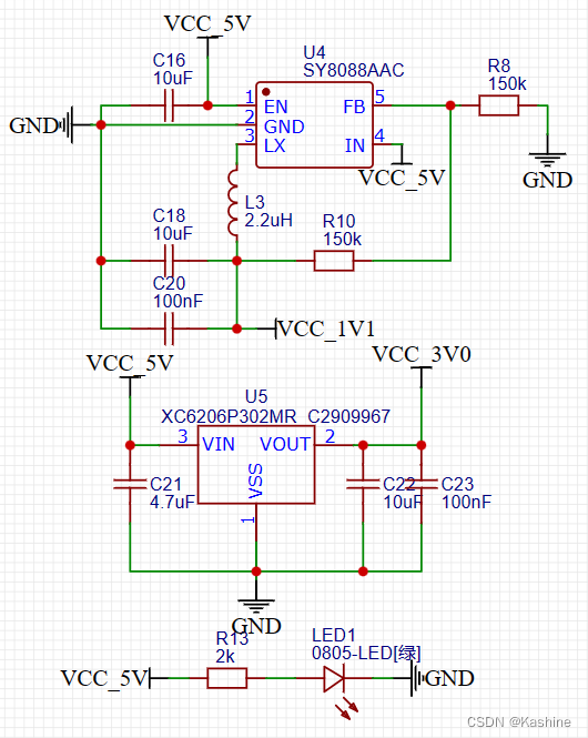 电路设计如下图所示,根据墨云所说电感选用2.2uH功率电感,电感额定电流为2A。 此处的5V电源来自底板的USB供电。下面电阻的搭配方式可以进行调节,只要满足输出的电压为需求电压即可