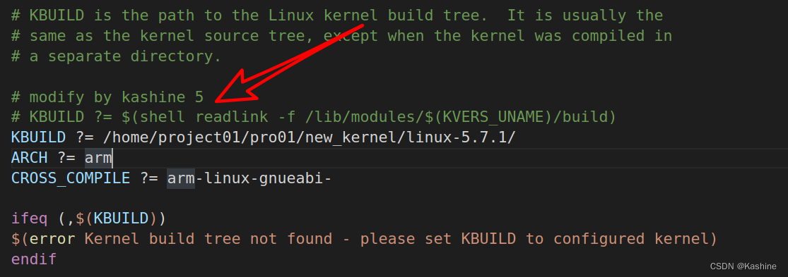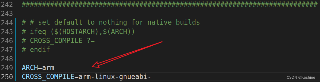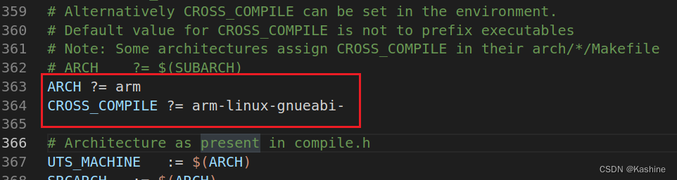 2. 内核配置与编译 🍍 基础配置与编译 解压完成后,使用VScode 打开linux源码,同uboot编译前一样进行配置,首先在顶层Makfile 中指定架构和交叉编译工具。*注意:arm必须是小写,必须!*