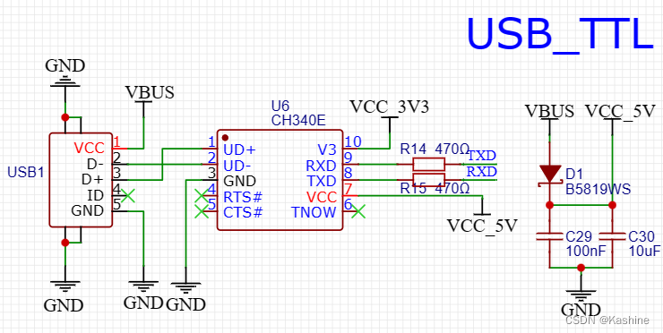 2、底板 🍍 串口转USB电路 选用CH340E芯片,注意某宝的芯片可能是拆机、复新芯片, 如果串口通信失败,考虑芯片问题。至于下面的接线,墨云提到:“根据CH340E官方的原理图,当VCC接入5V的时候,V3 需要接一个100nf的电容,但是此处在V3直接接入5V,也可以工作。” ,因此本文选择将VCC接入5V,将V3接入3.3V。