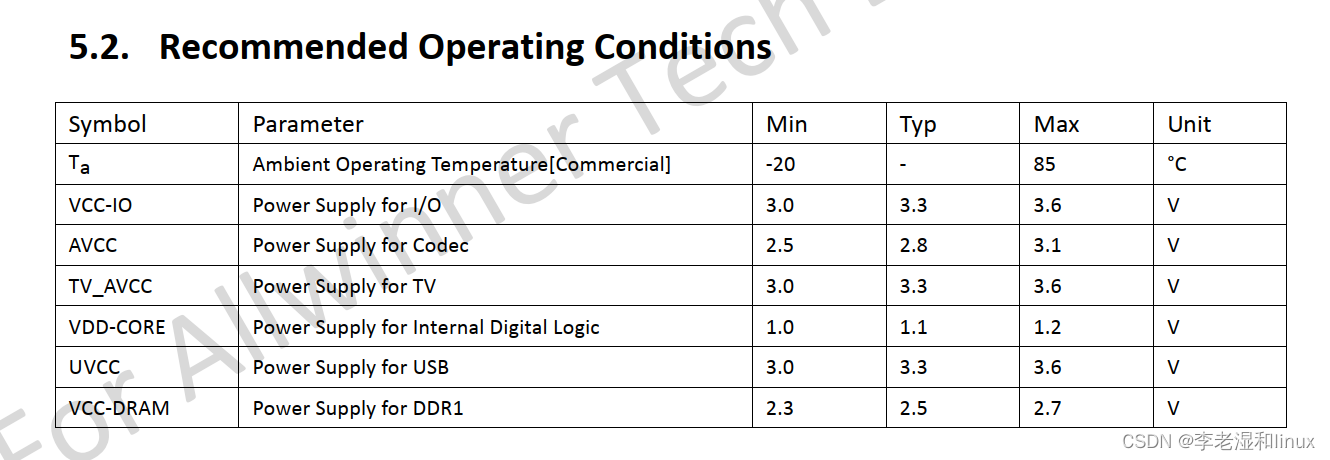 二、原理图设计 1、核心板 🍎 电源电路 在F1C200s的datasheet Allwinner_F1C200s_Datasheet_V1_1 中可以得到推荐的运行环境,主要参考Typ,也就是典型值: