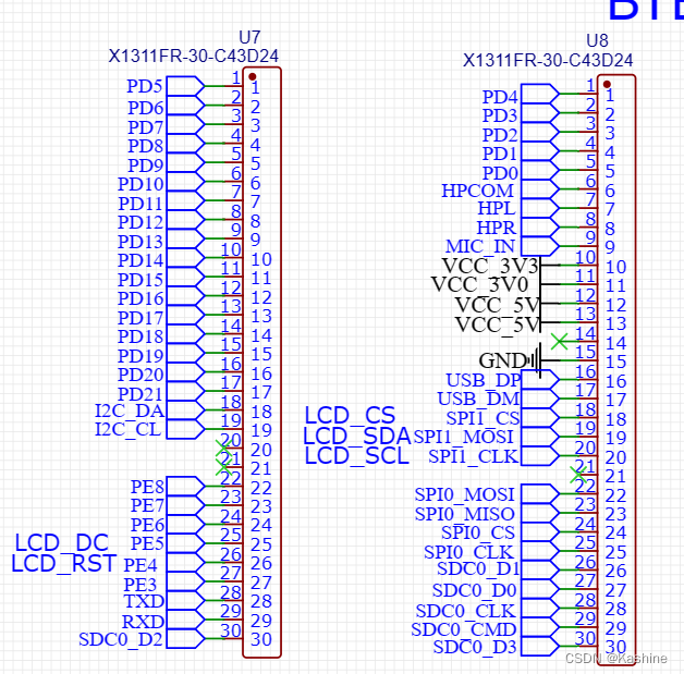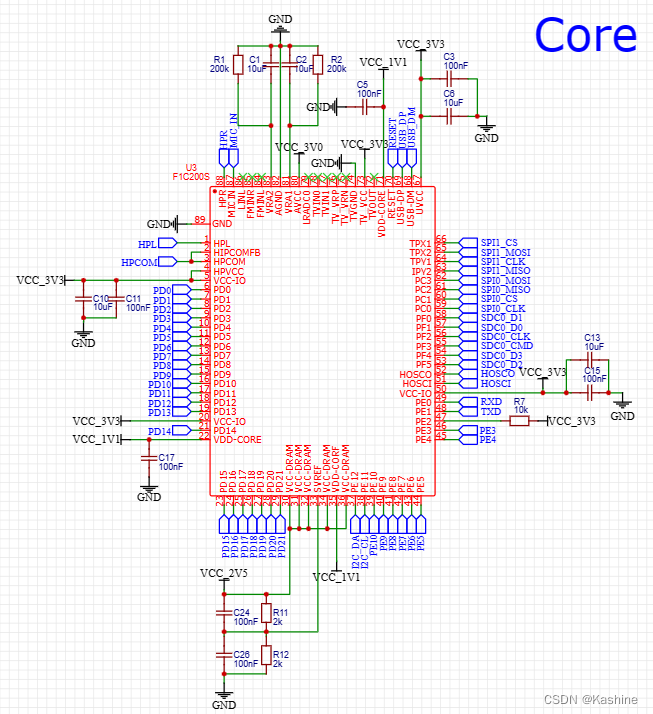 🍎 主控电路 主控电路主要参考墨云和稚辉君,相关链接见上方。主要从主控F1C200s中引出TF卡引脚(本文选用的系统加载电路)、音频、晶振、串口、复位、SPI、OTG、图像、一些GPIO等等。