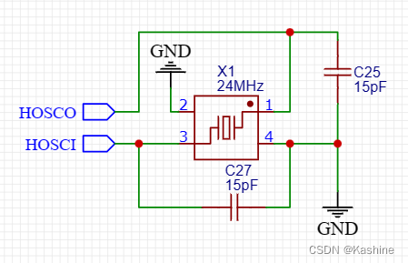 🍎 晶振电路 晶振采用24MHz无源晶振,两个15pF电容滤波。