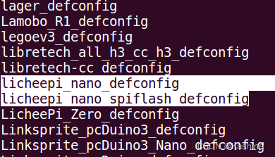 如上图所示,为uboot的configs目录 下的两个荔枝派的配置文件,第一个licheepi_nono_defconfig 是针对**TF卡*的配置文件,第二个 licheepi_nano_spiflash_defconfig *是针对 flash的启动文件,显然我们需要 选择第一个配置文件**编译uboot,因为我们只有TF卡一种存储介质,没有flash。下面是编译指令:
