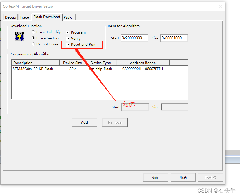 勾选-> Flash Download -> Reset and Run 选项
