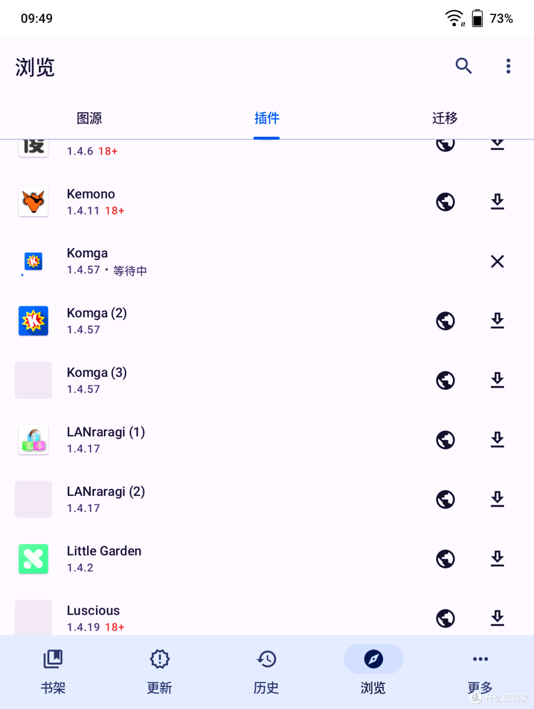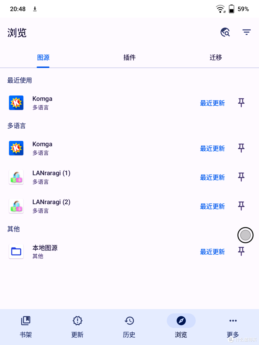 把刚才的地址粘贴进去;重启刷新;就看到插件Komga,还有一个LANraragi的漫画插件也在,我虽然安装了LANraragi的docker,但实际上没有使用过,这里就不说了。