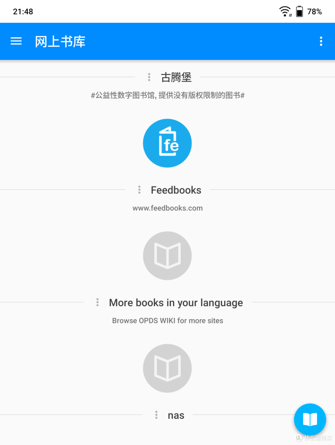 右上角增加新书库-输入你的calibre地址;名字随便,我这里命名nas,点击图标